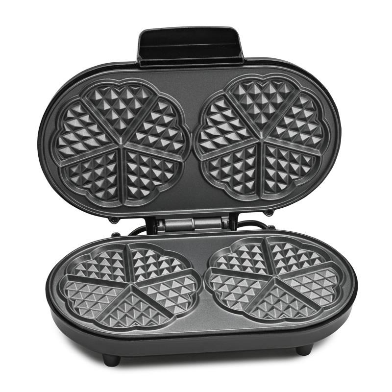 2 поверхні, кожна на 5 вафель у формі серця. Регульований термостат. Корпус із термостійкого пластику, декорованого нержавіючою сталлю. Світлові індикатори температури/живлення.