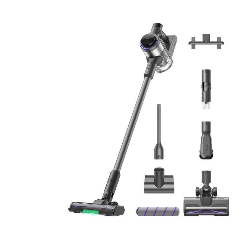 Сила всмоктування до 30000 Па. Технологія Anti-Tangle проти сплутування волосся та вовни. Розумний датчик забрудненості. Комплектація: Адаптер живлення, Бездротовий пилосос, Гарантійний талон, Комбінована широка насадка 2 в 1, Міні-турбощітка, Настінне кріплення, Роликова щітка м'яка, Інструкція користувача, Конектор, що згинається; Турбощітка універсальна, Центральна трубка, Щілинна насадка.